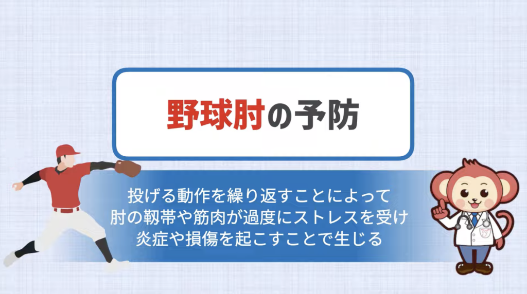 野球肘は、繰り返しの投球による肘への過度なストレスが原因で起こります。