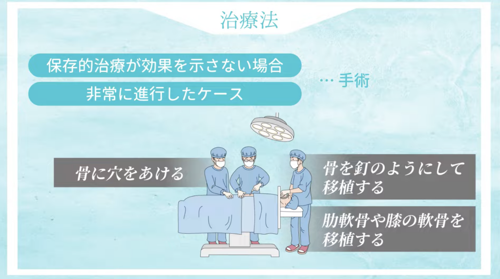 - 軟骨移植術: 他の骨の軟骨を移す