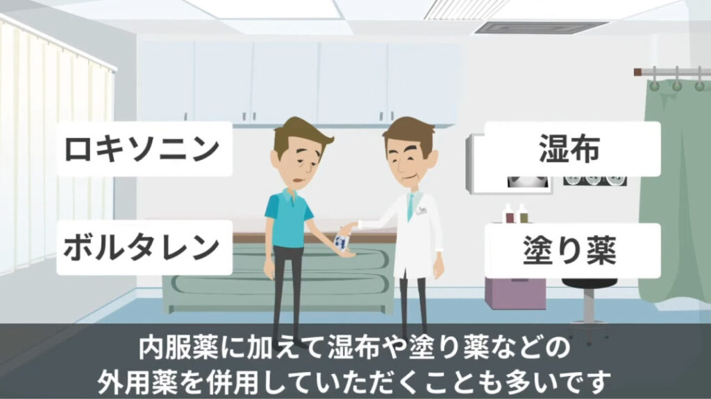 薬物療法:消炎鎮痛薬(NSAIDs)を中心に、症状に応じて貼付薬・外用薬を併用します。
