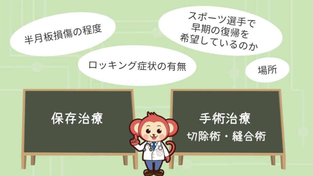 ロッキングや活動性、断裂形態によります。多くは保存療法から始め、必要時に関節鏡手術を検討します。