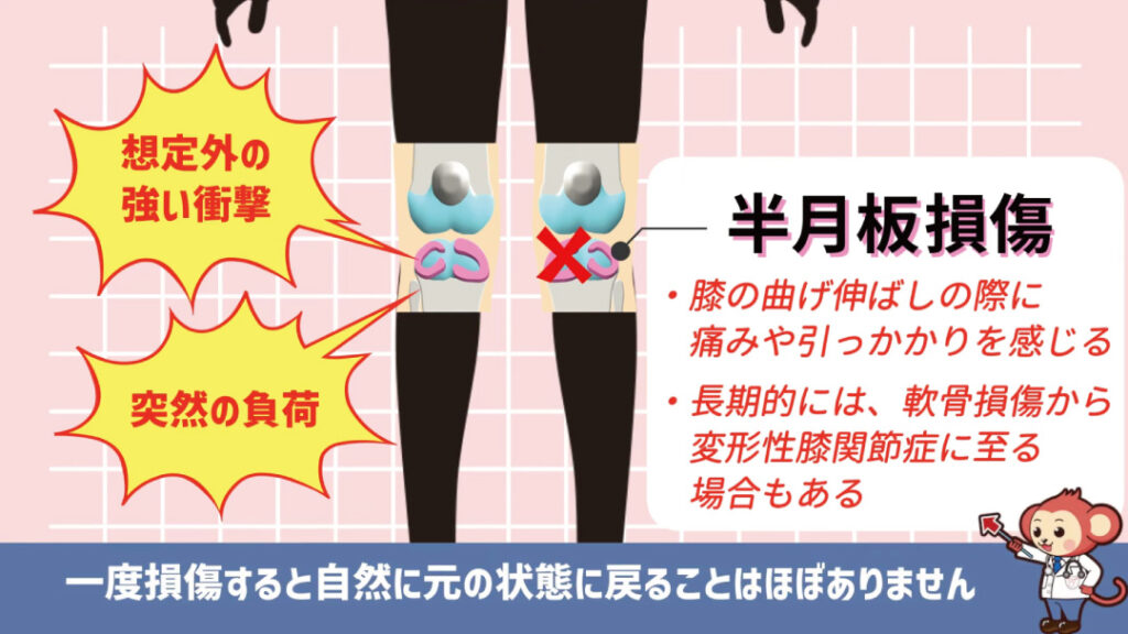 想定外の捻転や強い荷重、小さなストレスの反復、加齢変性などで損傷すると、膝の曲げ伸ばしで痛み・引っかかりを感じ、長期的には軟骨損傷→変形性膝関節症へ進むことがあります。
