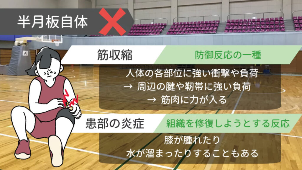 半月板自体は痛みを感じるセンサーがないため、半月板が傷んでるんじゃないんだよね。半月板の周囲には神経が豊富だから、その神経たちが痛みを疲労んだ。