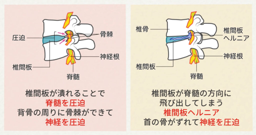 多くは加齢性変化(椎間板変性・骨棘・靭帯肥厚)椎間板ヘルニアによる脊髄圧迫で起こります。